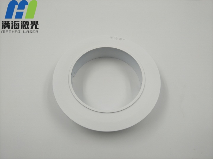 該款產(chǎn)品經(jīng)壓鑄成形之后,經(jīng)拋光噴涂之后直接激光其logo。客人要求鐳射后字體成冷灰色,其效果在參數(shù)調(diào)試時(shí)功率不宜過大,頻率稍高再結(jié)合產(chǎn)品本身噴涂的厚薄進(jìn)行調(diào)試即可。